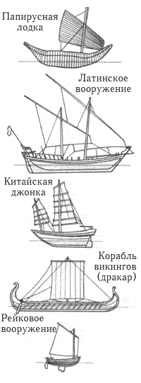 За исключением корабля викингов, оснащенного большим прямым парусом, все показанные здесь