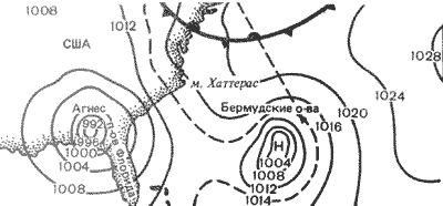 29б. Синоптическая карта за 6.00 20 июня 1972 г. Центр циклона находится к юго-западу от Бермудских