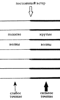 от ситуации, изображенной на рис. 52, здесь более пологие волны указывают на сильное течение,