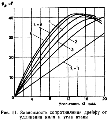 удлинения киля на величину развиваемой им силы сопротивления дрейфу Rд можно оценить по